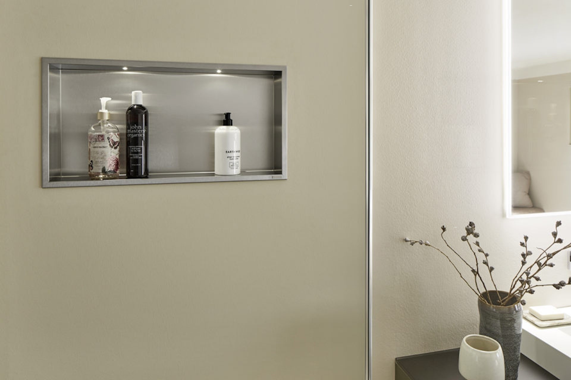 Ngay từ khi sửa sang, xây dựng, nếu đề nghị với thợ, bạn có thể có chỗ trữ đồ nhờ các hốc trên tường. Những hốc này làm nơi đặt chai, lọ, sữa rửa mặt, sữa tắm, dầu gội... Với việc làm các hốc này, không chỉ có thêm chỗ để trữ đồ mà còn giảm bớt sự khô cứng của tường, mở rộng hiệu ứng thị giác tốt hơn.
