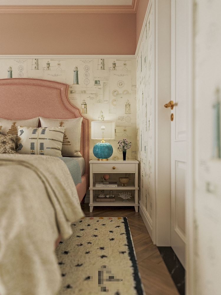 | Chi tiết nhỏ từ đèn ngủ, chăn ga, giấy dán tường đều rất chỉn chu. Gam hồng với sắc độ vừa phải, không bị rực rỡ hay quá gắt. |