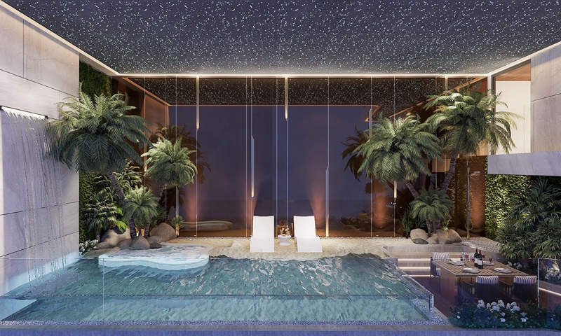 Tại khu vực ban công Sky Villa, một “bãi biển tư gia” sử dụng công nghệ lọc Bio-natural Pool tân tiến sẽ được thiết kế với bề mặt cát nén tự nhiên cùng hệ thống làm nóng nước Heat pump tiêu chuẩn Châu Âu, giúp chủ nhân thoải mái tận hưởng làn nước ấm bên hiên nhà ngay giữa mùa giá lạnh.