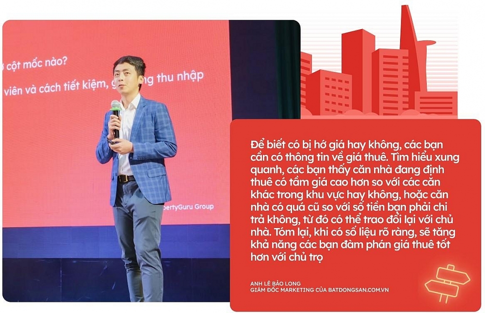 (Xây dựng) - Vừa qua, Batdongsan.com.vn đã tổ chức workshop “Đồng tiền đi liền kinh nghiệm” tại trường Đại học Kinh tế - Luật (Đại học Quốc gia Thành phố Hồ Chí Minh) với những chia sẻ từ ông Lê Bảo Long, Giám đốc Marketing, Batdongsan.com.vn cùng hai nhà sáng tạo nội dung đình đám Meichan và Nam Khánh. Sự kiện thu hút hơn 250 sinh viên tham gia, đã mang đến nhiều thông tin bổ ích về kinh nghiệm thuê nhà và tài chính cá nhân cho các bạn trẻ.