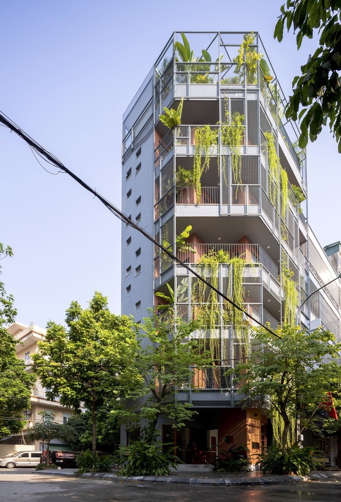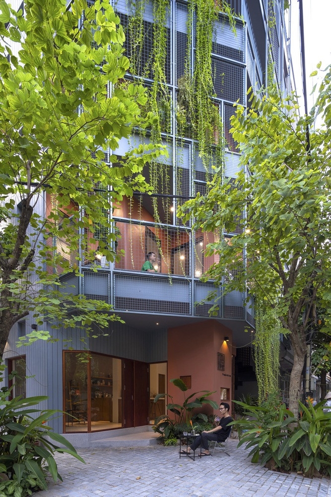 Căn nhà phố ấn tượng với “tấm rèm xanh” phủ mặt tiền. Với thiết kế khéo léo kết hợp giữa hình khối, màu sắc, vật liệu, cây xanh… đáp ứng nhu cầu vừa kinh doanh cafe, vừa cho thuê căn hộ của gia chủ.