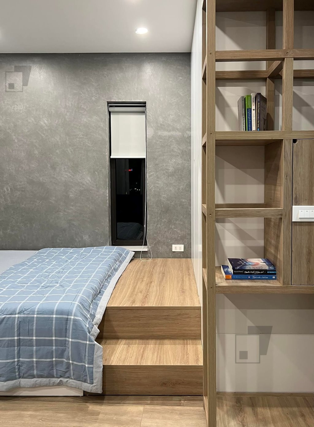 | Phòng ngủ thiết kế nội thất đơn giản, sử dụng vật liệu chủ đạo là gỗ công nghiệp để tiết kiệm chi phí. |