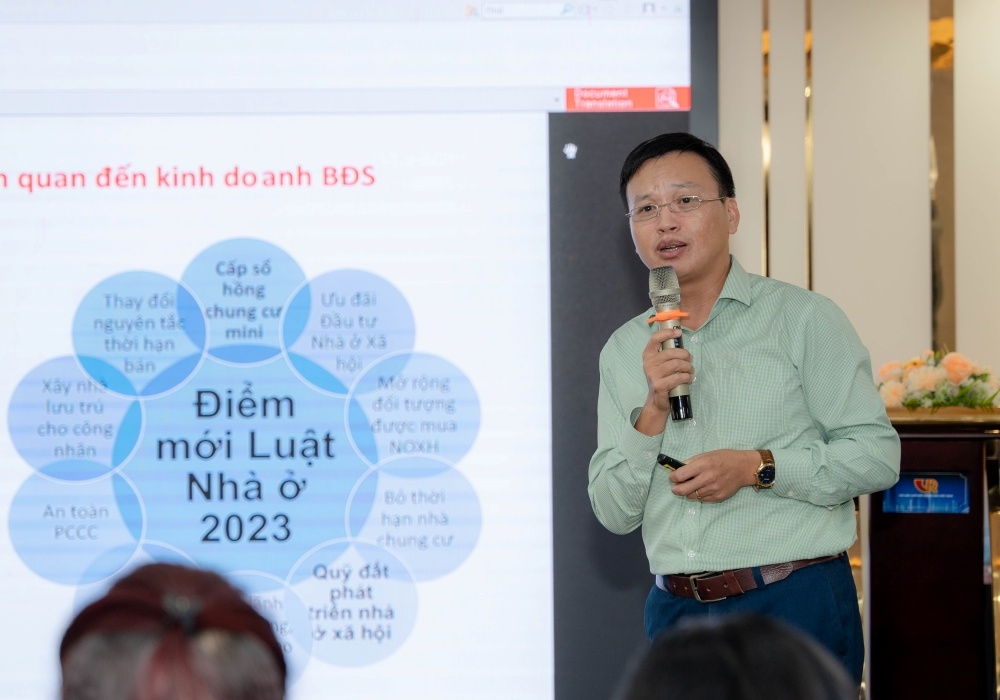 | TS. Trần Xuân Lượng, Phó Viện trưởng Viện Nghiên cứu đánh giá thị trường bất động sản Việt Nam trình bày nội dung Luật Nhà ở 2023 tại Hội nghị. |